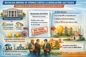 El Juzgado Federal de Santa Rosa rechazó la acción de amparo presentada por la Federación Pampeana de Cooperativas Eléctricas y de Servicios Públicos (Fepamco) contra la Resolución 267/2024 del Ministerio de Economía de la Nación, que prohíbe, por ejemplo, incluir cargos de tasas municipales en las facturas de electricidad. El juez federal Juan José Baric, al resolver la cuestión de fondo, estableció que la norma no es inconstitucional, según el fallo al que accedió Diario Textual. De todas maneras, dispuso un plazo de 90 días para que cooperativas y municipios de La Pampa adecuen la modalidad de cobro de las tasas municipales.